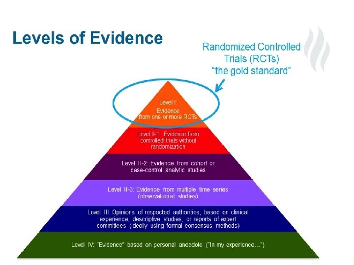 Study Design and Its Strength of Evidence 1. 2. 3. Systematic review, meta-analysis: secondary data analysis Randomized Controlled Trials (RCT) Cohort: prospective or retrospective Strongest evidence Quasi experiment 4. 5. 6. Case control: prospective or retrospective Cross sectional Weakest Case Reports / Case Series evidence