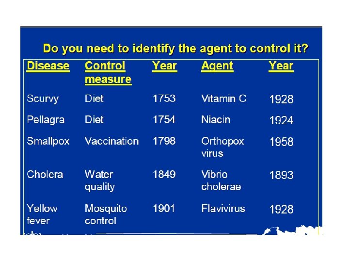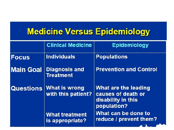 Uses of Epidemiology • To make a community diagnosis. Epidemiology helps to identify and describe health problems in a community (for example, the prevalence of anemia, or the nutrition status of children). • To monitor continuously over a period of time the change of health in a community. (for example, the effect of a vaccination program, health education, nutritional supplementation). To practice surveillance for a specific disease in order to be able to act quickly and so cut short any outbreak (example cholera). • To investigate an outbreak of a communicable disease, analyze the reasons for it, plan a feasible remedy and carry it out, and monitor the effects of the remedy on the outbreak. • • To plan effective health services. Effective services, interventions and remedies all depend on accurate community data.