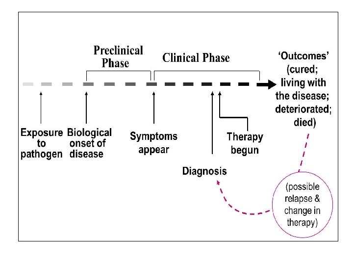 Four stages in the natural history • 1. Stage of susceptibility • In this stage, disease has not yet developed, but the groundwork has been laid by the presence of factors that favor its occurrence. • Example: unvaccinated child is susceptible to measles. • 2. Stage of Pre-symptomatic (sub-clinical) disease • • • In this stage there are no manifestations of the disease but pathologic changes (damages) have started to occur in the body. The disease can only be detected through special tests since the signs and symptoms of the disease are not present. Examples: • Detection of antibodies against HIV in an apparently healthy person. • Ova of intestinal parasite in the stool of apparently healthy children. The pre-symptomatic (sub-clinical) stage may lead to the clinical stage, or may sometimes end in recovery without development of any signs or symptoms.