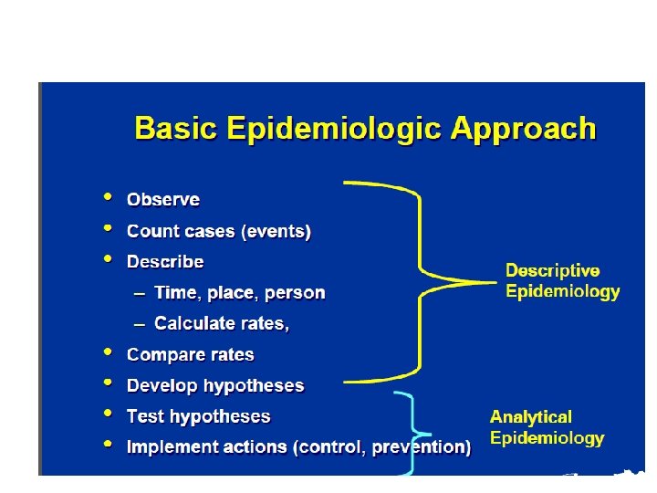 Epidemiological Principles • • Diseases (or other health events) don’t occur at random • • Diseases (or other health events) have causal and preventive factors which can be identified • Diseases and health have a distribution • Epidemiology focuses on populations rather than individual persons, tissues or organs.