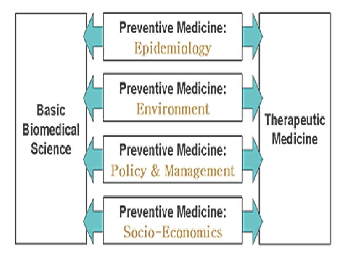 Epidemiology and Preventive Medicine • Epidemiology is the central science of public health, and preventive medicine is a clinical approach to public health practice. • Epidemiology can provide the preventive medicine practitioner with the following: • - Information on the state of the health of the population. • - Methods for identifying possible determinants of health and disease within individuals. • - Appropriate population groups for interventions. • - Understanding the origins of public health recommendations.