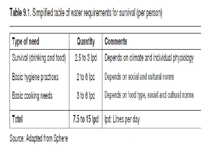 Information of water sources Sources Quality Quantity Accessibility Reliability Cost Good for mountain streams; poor for Streams and streams in lowland Rivers regions; treatment necessary. Maintenance required for both Moderate: seasonal Generally good; type systems; variation likely; need intake for much higher for some rivers and both gravity flow pumped system; streams will dry up and piped riverside well is a in dry season. delivery. good reliable source. Moderate to high depending on method; treatment and pumping expensive. Fair to poor; Rain disinfection Catchments necessary Moderate and variable; supplies unavailable during dry season; storage necessary. Low-moderate for roof catchments; high for ground catchments Good; cisterns located in yards of users; fair for ground catchments. Must be rain; some maintenance required.