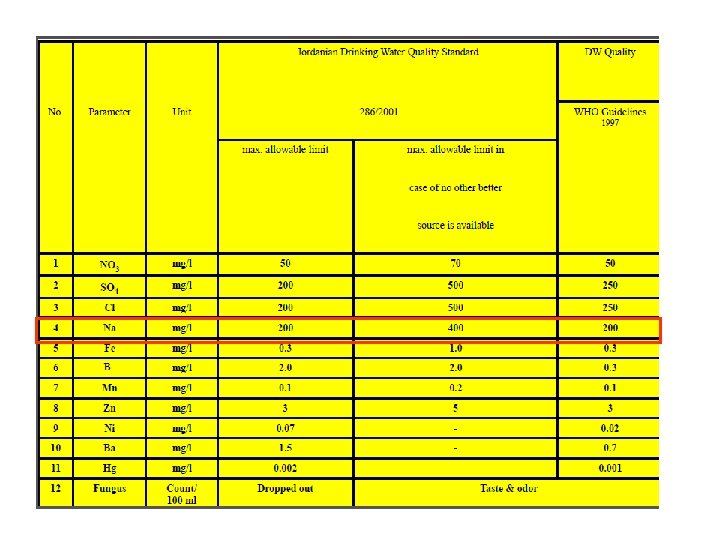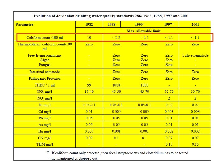 Standard conditions 1 Microbial Parameters 1. 1 The maximum allowable limit for the TCC (MPN/100 ml) should be < 1. 1 as a result of the Multiple Tube Test and 0 as result of the Membrane Filtration Test. 1. 2 The sample should be free from a) Thermo tolerant coli form bacteria, and b) Enteric viruses and germs 2 Biological Parameters: Drinking water should be free from a) Any pathogenic protozoa b) Any pathogenic nematode eggs c) Any free living pathogens, and d) Fungus. 3 Physical Characteristics The physical characteristics of water should be as follows: a) Taste: Acceptable for the majority of people b) Odor: Acceptable for the majority of people c) Color: The maximum allowable limit is 10 units – 15 units d) Turbidity: The maximum allowable limits is 1 – 5 NTU. 4 Chemical Characteristics Where chlorine is used to disinfect the drinking water, the maximum allowable limit for free chlorine supplied to the consumer is 0. 2 -1 mg/l after 15 minutes from disinfection and 15 minutes before arriving to the consumer. Parameters Related to Water Taste read as indicated in the following table. Note that the lower range level is obligatory for private wells.