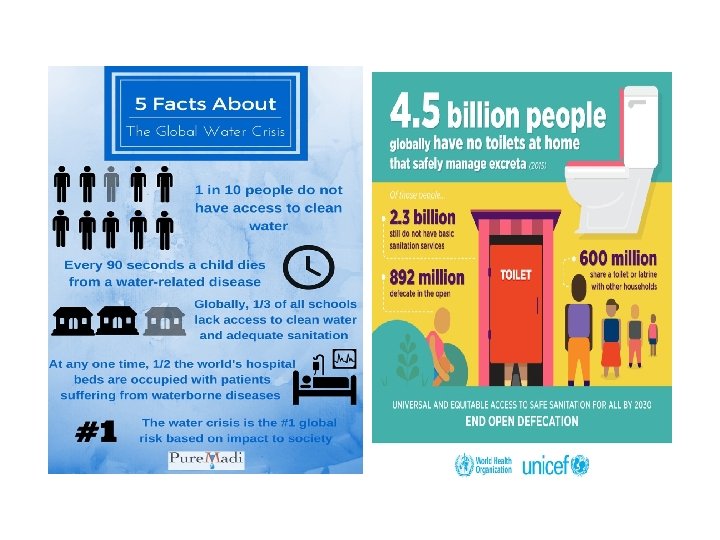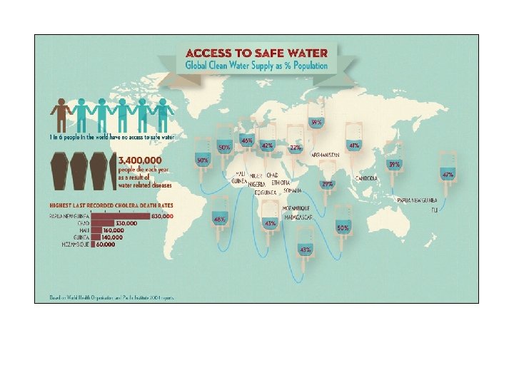 • In 2015, 71% of the global population (5. 2 billion people) used a safely managed drinking-water service – that is, one located on premises, available when needed, and free from contamination. • 844 million people lack even a basic drinking-water service, including 159 million people who are dependent on surface water. • Globally, at least 2 billion people use a drinking water source contaminated with faeces. • Contaminated drinking water is estimated to cause 502 000 diarrhoeal deaths each year. • In low- and middle-income countries, 38% of health care facilities lack an improved water source, 19% do not have improved sanitation, and 35% lack water and soap for handwashing.