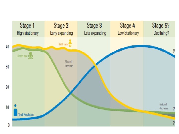 demographic stages ●● Late expanding (third stage) : The third stage is characterized by further decline in the death rate while birth rate tends to fall that results in increase in the population growth. ●● Low stationary (fourth stage) : The fourth stage is characterized by a low birth rate and low death rate; the balance between them results in no population growth that is referred to as the “low Stationary Stage” of population growth. ●● Declining (fifth stage) : The fifth stage is characterized by a birth rate lower than death rate the balance between them results in decline in population growth that is referred to as the “Declining Stage” of population growth.
