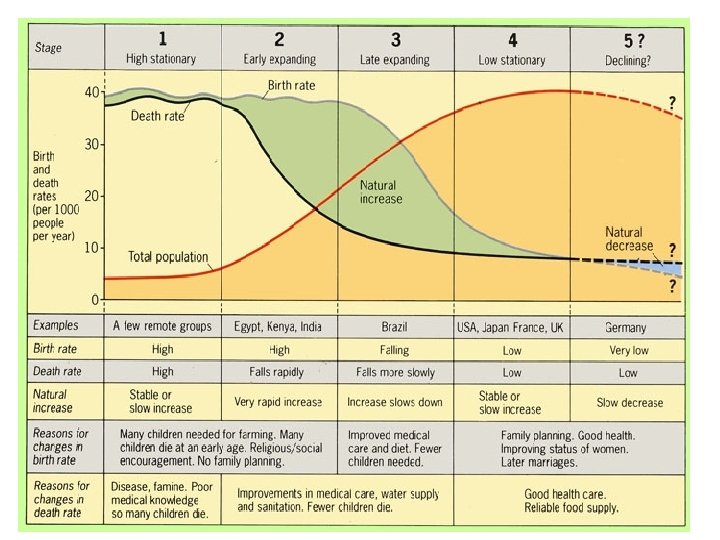 demographic stages ●● High stationary (first stage) : The first stage is associated with pre Modern times, and is characterized by very high birth rates and very high death rate (30 -50 per 1000) balance between them results in only very slow population growth that is referred to as the “High Stationary Stage” of population growth. ●● Early expanding (second stage) : The second stage is characterized by a rise in population caused by a decline I the death rate while the birth rate remains unchanged, or perhaps even rises slightly.