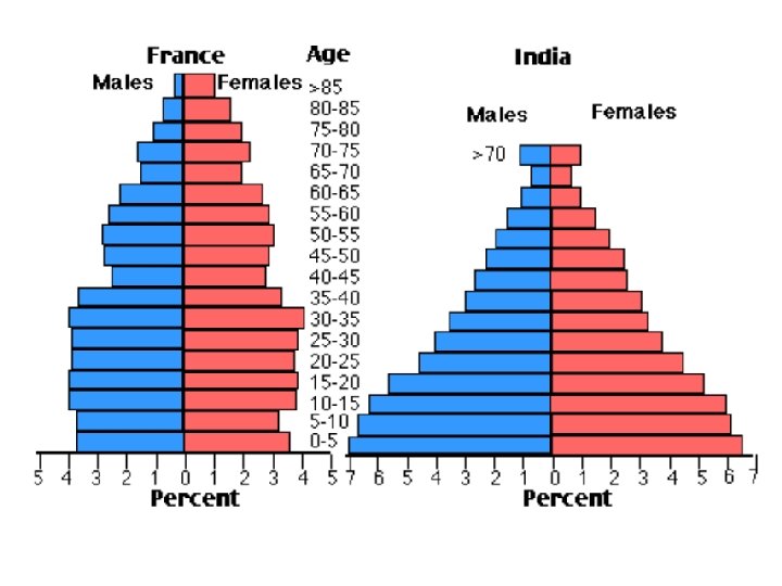 Age structure • Population profiles shows the age structure of a population, which is the distribution of population by age and sex • These profiles help demographers project how populations will change over time. • shows the age and gender composition of a region • horizontal axis: divides gender and shows absolute number of people or in percentage of population o male: left-hand female: right-hand • vertical axis: age in 5 -year or 10 -year intervals