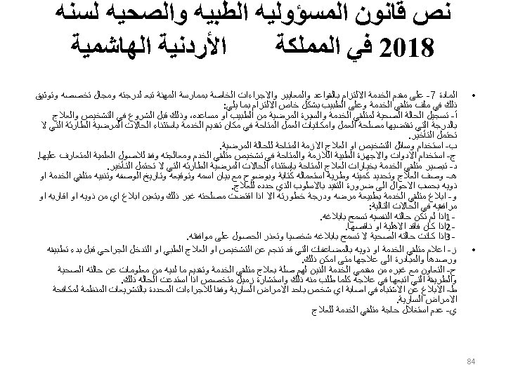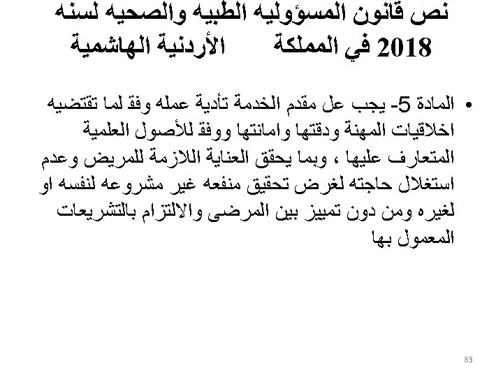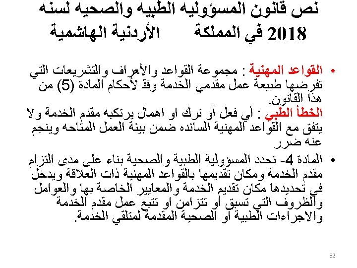 Professional Negligence ﺍﻻﻫﻤﺎﻝ (malpractis) • Negligence - doing something that one is not supposed to do, or failing to do something that he is supposed to do • Professional negligence – - absence of reasonable care and skill, -or wilful ( )ﻣﻘﺼﻮﺩ ﺍﻭ ﺑﻌﻨﺪ negligence of a medical practioner in the treatment of patient which causes bodily injury or death of patient 72