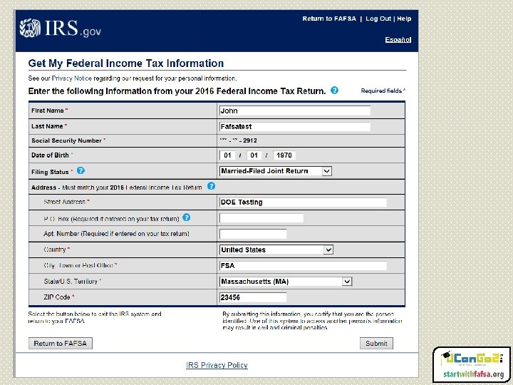 FSA ID Information Match Personal information will be matched with eight government agencies • • Social Security Administration Department of Defense Department of Justice Homeland Security Internal Revenue Service Selective Service Veterans Affairs National Student Loan Data System (NSLDS)