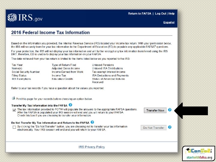 IRS Data Retrieval Tool • IRS sends tax data directly to FAFSA • Voluntary, but strongly recommended • Reduces documents requested by financial aid office and speeds up awarding process • Due to increased security measures, transferred data will not show on screen • Financial aid office must make any changes to transferred data