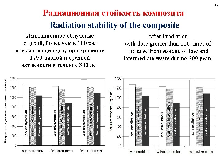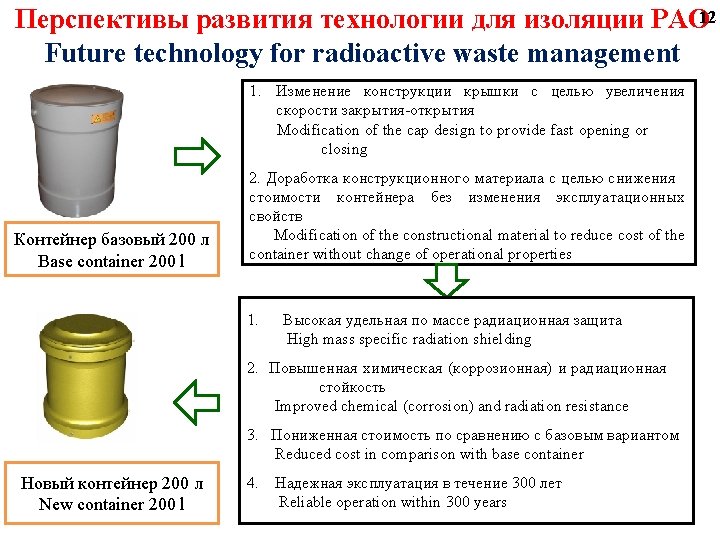 4 Базовый контейнер КХС-02 К Base container КHS-02 К Назначение Сбор, транспортирование, хранение и захоронение РАО I-й и II-й группы по СПОРО-85 (низкои среднеактивные отходы). Function Collection, transportation, storage and disposal of radioactive waste of the 1 st and 2 nd groups by sanitary regulations-85 (low and intermediate waste) Емкость, м 3 0, 2 Volume, m 3 0, 2 Масса, кг 47 Net weight, kg 47 Период эксплуатации, лет (не менее) 300 Operation life, years (no less) 300 Механические свойства: Mechanical properties: Прочность на растяжение, МПа 190 -210 Модуль упругости, МПa 2, 5× 104 Относит. удлинение, % 0, 6 Tensile strength, MPa 190 -210 Modulus of elasticity, MPa 2, 5× 104 Elongation, % 0, 6