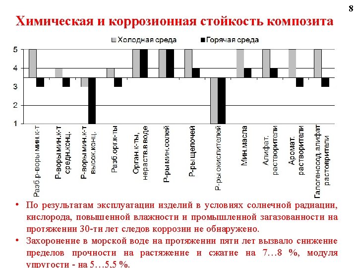 Chemical and corrosion resistance of the composite • Composite use under solar radiation, oxygen, increased humidity and industrial gas-poluted conditions during 30 years revealed no traces of corrosion. • Disposal in sea water for 5 years caused reduction of tensile and compression strength less than 10%, modulus of elasticity - less than 6 %. 9