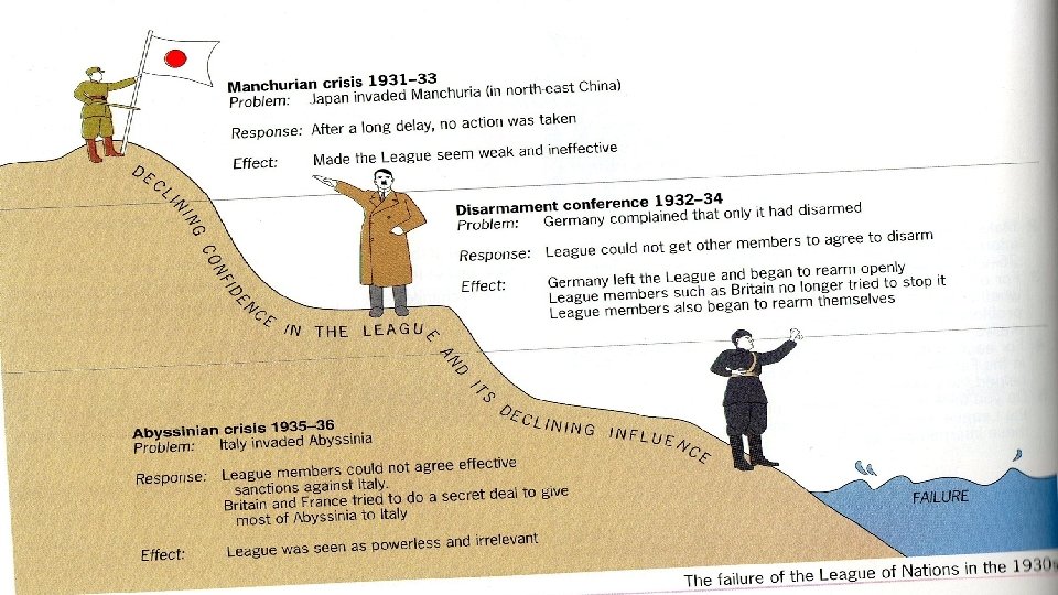 § The League of Nations in the 1930 s failed to prevent many different conflicts from going on, this created a lot of tension between nations, violence, political changes, and ultimately led to the second world war. § There were two main things the Lo. N did that allowed for these failures to continue: § 1. Non-intervention – is when one does not involve themselves with foreign affairs. § Ex. Did not want to get involved with the affairs of the Spanish Civil War § Kind of makes you think of being lazy § 2. Appeasement - is the act of giving into, or satisfying ones demands. § Ex. Let Hitler begin rearming Germany so he would not want to wage war § Kind of makes you think of being cowardly