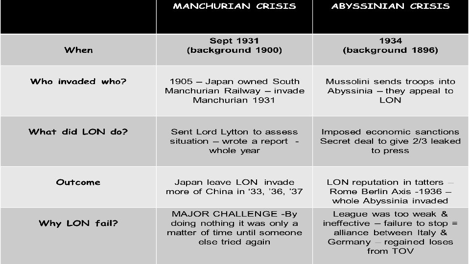 § This crisis = the fatal blow to the LON in 1935. § Similarities & differences to Manchurian crisis: § Like Japan, Italy was a leading member of the LON & Italy wanted to expand its Empire. § Unlike Manchuria; this was on the LON doorstep –bordered French & British colonies. § LON had claimed Manchuria was a special case, too far away – would Abyssinia be the same.