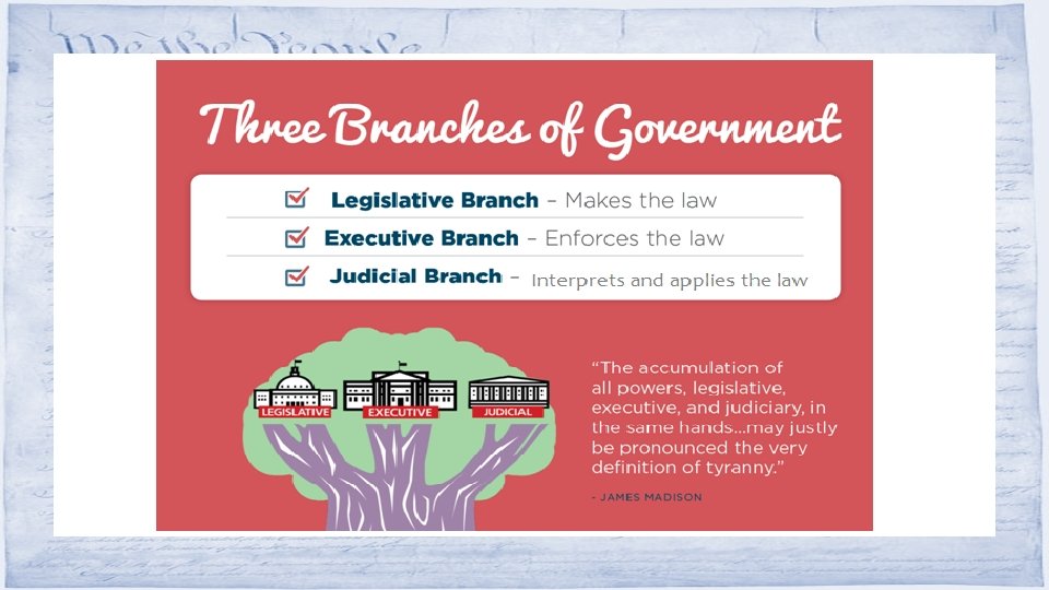 What If One Branch Could… …make the law …enforce the law …and interpret and apply the law? Total power in one branch of the government