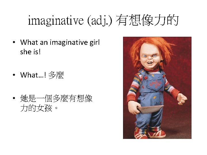 destroy (v. ) 摧毀 • The house was completely destroyed by the 921 earthquake. • completely: 徹底地 • earthquake: 地震 • 這房子在 921大地震時徹底地 被摧毀。