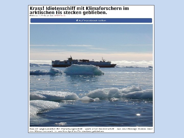 Beleidigungen und Hetze Bei diesen merkwürdigen Ölfirma verklagt wegen Falschangaben Gestalten in der zum Klimawandel. Forschung, ist es kein Idiotenschiff mit Klimaforschern im Wunder, dass man zu so Eis stecken geblieben. seltsamen Ergebnissen Das ist WAHNSINN!!! Achtung: kommt. Übertriebene Schlagzeilen Keine/ungenau Herkunftsangabe Quelle: Deutsche Presse Agentur Impressum: Die Zeit; Buceriusstraße 1; Hamburg Politiker planen für den Klima-Ernstfall falsche „Experten“ Die Fakten gegen den Klimawandel nennt Dr. Axel, Chef einer Autofirma. Die Fakten für den Klimawandel bestätigte Dr. Alex, Klimaforscher. Keine/ungenaue Quellen der Infos Laut einer uns vorliegenden Studie, können diese Zahlen nicht bestätigt werden. Die Zahlen über den Klimawandel veröffentlichte die Oxford Universität. Veraltete Informationen Wie? Quelle: www. die-wahrheit. de Impressum: - Was? Wer? erkennt man Fake News? Bilder prüfen/andere Quellen heranziehen Ein Bericht aus dem Jahr 1982 belegt, dass es kühler geworden ist. Neueste Tests aus dem Jahr 2017 zeigen, dass es heißer geworden ist. Meinungen statt Beweise/Fakten Wie Wo? Einseitige Darstellung (lässt keine andere Meinung zu) Nur dieser Bericht zeigt uns die Wahrheit! Alles andere ist Fake News. Warten! Vor dem teilen, nachdenken Nach Meinung unseres Experten, stimmt die Aussage überhaupt nicht. 97 Prozent der Klimaforschungen beweisen, dass der Klimawandel bereits stattfindet.