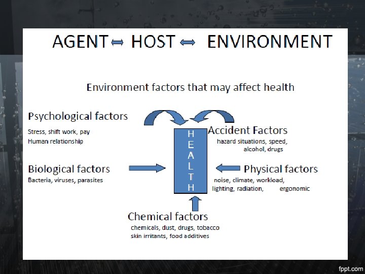 Hazard Biologi • MIKRO ORGANISME (bakteri, virus, fungi) toksin, infeksi, alergi • ARTHROPODA (serangga, dll) sengatan infeksi • TUMBUHAN TINGKAT TINGGI (toksin & allergen) dermatitis, asma, pilek • TUMBUHAN TINGKAT RENDAH (yang membentuk spora) • VERTEBRATA (protein allergen) urine, saliva, faeces, kulit/rambut allergi • INTERVETEBRATA selain ARTHROPODA (cacing, protozoa)