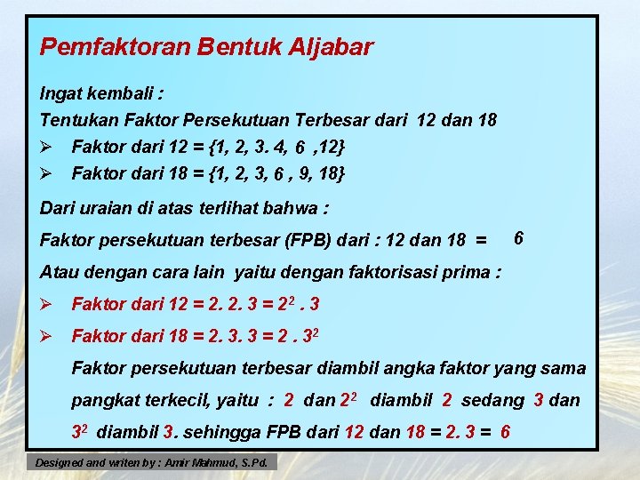 Pemfaktoran Bentuk Aljabar Ingat kembali : Tentukan Faktor Persekutuan Terbesar dari 12 dan 18 Ø Faktor dari 12 = {1, 2, 3. 4, 6 , 12} Ø Faktor dari 18 = {1, 2, 3, 6 , 9, 18} Dari uraian di atas terlihat bahwa : Faktor persekutuan terbesar (FPB) dari : 12 dan 18 = 6 Atau dengan cara lain yaitu dengan faktorisasi prima : Ø Faktor dari 12 = 2. 2. 3 = 22. 3 Ø Faktor dari 18 = 2. 3. 3 = 2. 32 Faktor persekutuan terbesar diambil angka faktor yang sama pangkat terkecil, yaitu : 2 dan 22 diambil 2 sedang 3 dan 32 diambil 3. sehingga FPB dari 12 dan 18 = 2. 3 = 6 Designed and writen by : Amir Mahmud, S. Pd.