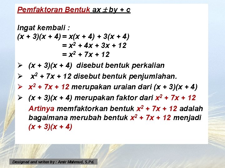 Pemfaktoran Bentuk ax by + c Ingat kembali : (x + 3)(x + 4) = x(x + 4) + 3(x + 4) = x 2 + 4 x + 3 x + 12 = x 2 + 7 x + 12 Ø (x + 3)(x + 4) disebut bentuk perkalian Ø x 2 + 7 x + 12 disebut bentuk penjumlahan. Ø x 2 + 7 x + 12 merupakan uraian dari (x + 3)(x + 4) Ø (x + 3)(x + 4) merupakan faktor dari x 2 + 7 x + 12 Artinya memfaktorkan bentuk x 2 + 7 x + 12 adalah bagaimana merubah bentuk x 2 + 7 x + 12 menjadi (x + 3)(x + 4) Designed and writen by : Amir Mahmud, S. Pd.