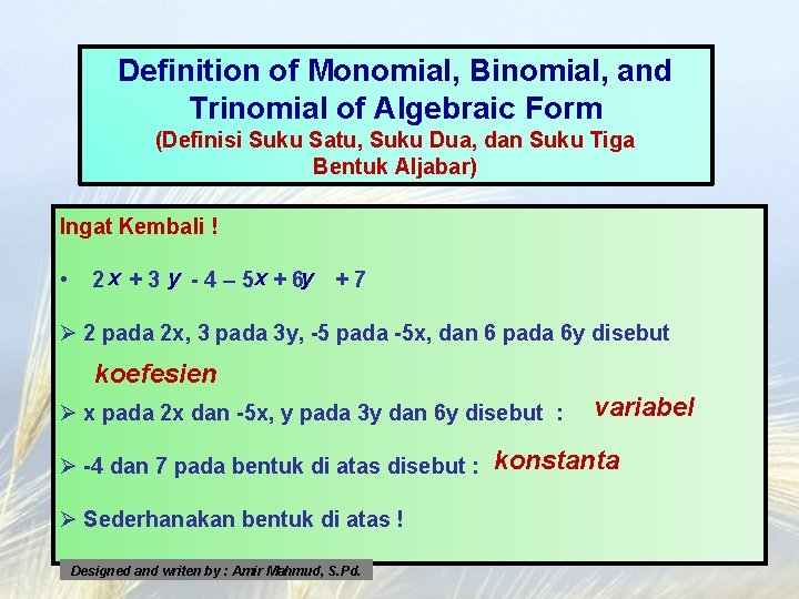 Ø Ø Ø 2 x, -x, 3, 4 y, 5 p 2, -6 q masing-masing disebut suku satu (Monomial). 2 x + 5, 3 – 4 y, 3 x + 2 y, 7 a + 2 b masing-masing disebut suku dua (binomial). 2 x + 2 y -1 , 5 a – 2 b + 3, 2 – 4 x + y masing-masing disebut suku tiga (trinomial) Designed and writen by : Amir Mahmud, S. Pd.