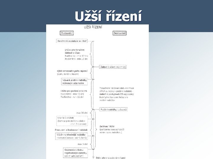 Rozdělení veřejných zakázek podlimitních a nadlimitních Podle druhů řízení: § Otevřené řízení - zadavatel oznamuje neomezenému počtu dodavatelů svůj úmysl zadat veřejnou zakázku. Vyzývá všechny zájemce. § Užší řízení - zadavatel oznamuje neomezenému počtu dodavatelů svůj úmysl zadat veřejnou zakázku, veřejný zadavatel vyzývá nejméně 5 zájemců k žádosti o účast. § Zjednodušené podlimitní řízení -jen veřejný zadavatel, vyzývá nejméně 5 zájemců k podání nabídky, zadavatel není povinen uveřejňovat oznámení zadávacího řízení v informačním systému o VZ – zkrácení délky řízení, je oprávněn zrušit jednací řízení do doby uzavření smlouvy, s udáním důvodu.