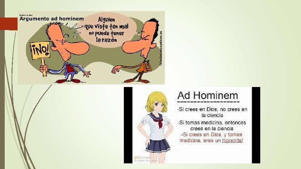 Falacia ad hominem en esta falacia se desconoce el argumento, ciertas ideas o conclusiones tomando solo en consideración las características negativas (más o menos distorsionadas y exageradas) de quien propone esa idea, en vez de criticar la idea en sí o el razonamiento que ha llevado a ella. Ahora bien, resaltar características negativas no sierpe es una falacia, por ejemplo: un individuo que como modo de vida engaña a la gente y trata de defender la honestidad como una virtud destacable, si podría ser parte de las características a tocar dentro de un argumento en que intente mostrar la importancia de la honestidad.