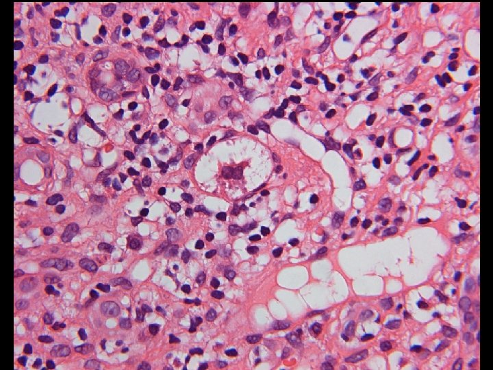 Diagnose einer NASH (Mindestkriterien) • Überwiegend makrovesikuläre, Läppchenzentren betreffende Steatose, die im Stadium der Zirrhose aber verschwinden kann; • Milde Infiltration des Leberparenchyms durch neutrophile Granulozyten und Rundzellen; • Ballonierung der Hepatozyten.