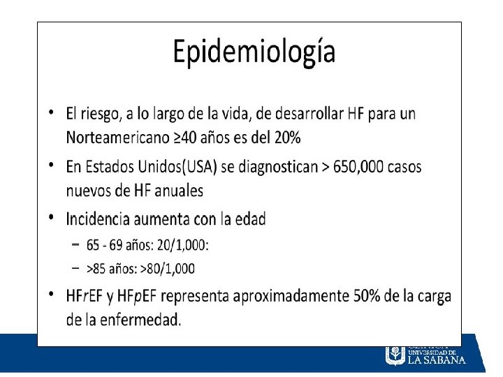 definiciones Clasificación Fracción de eyección 1. Falla cardiaca con reducción <40% de fracción de eyección 2. FE preservada >50% a. Borderline 41 -59 b. Mejorada > 40