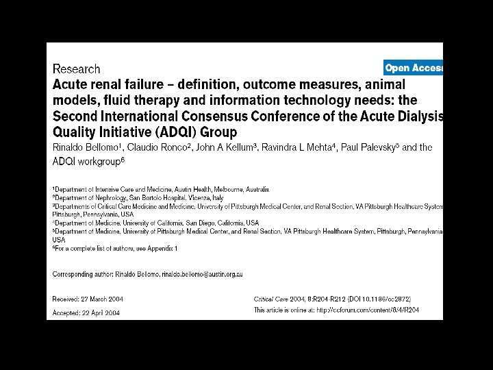 DEFINICIÓN Bellomo R, Ronco C, Kellum JA, et al. Acute renal failureddefinition, outcome measures, animal models, fluid therapy and information technology needs: the second international consensus conference of the Acute Dialysis Quality Initiative (ADQI) group. Crit Care 2004; 8: R 204– 12.