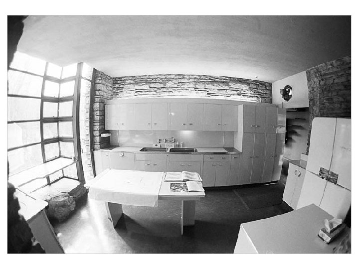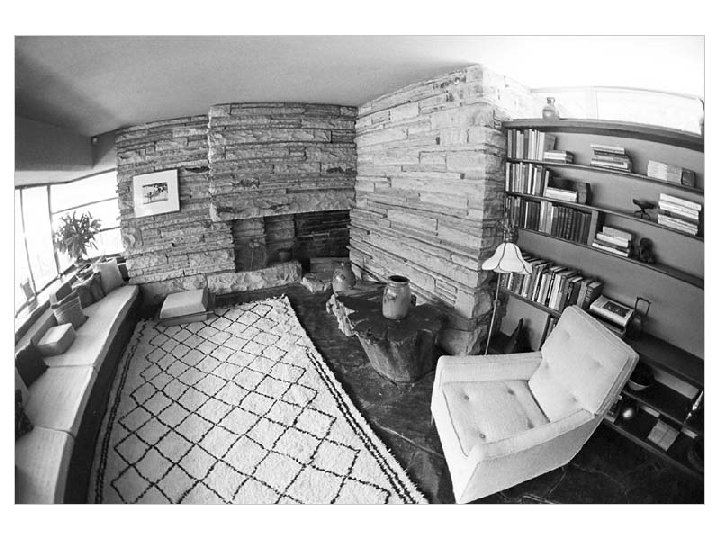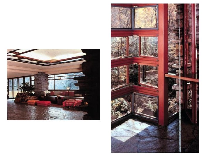 5. - Elements decoratius • No hi ha cap referència classicista, com era moda als EUA en aquell moment. • Total austeritat. • L’arquitecte va dissenyar el mobiliari de la casa. • Els grans finestrals fan que la visió interna vagi de dintre cap enfora, sensació que facilita que la natura exterior i l’interior de l’edifici s’integrin en una sola unitat • La utilització de pedra natural per recobrir els murs, de la fusta i altres materials càlids donen a l’edifici una gran harmonia, totalment contraposada als interiors racionalistes.