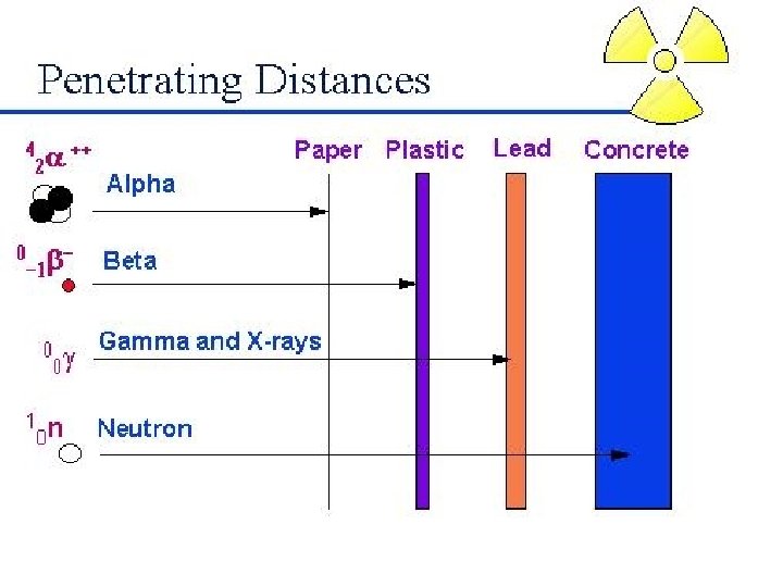 alpha, beta, and gamma • These three forms of radiation can be distinguished by a magnetic field since • the positively-charged alpha particles curve in one direction, • the negativelycharged beta particles curve in the opposite direction, • and the electricallyneutral gamma radiation doesn't curve at all.