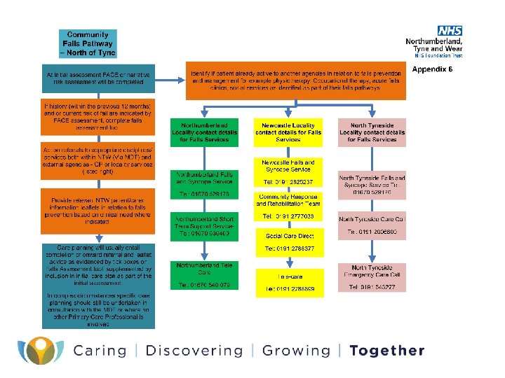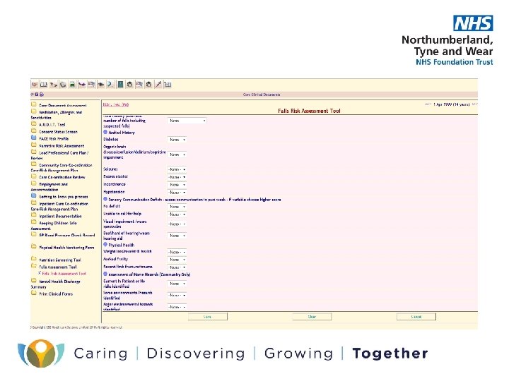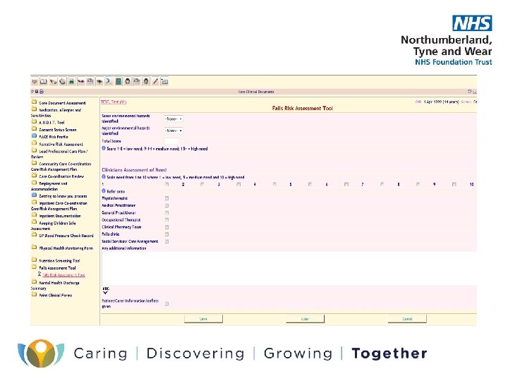 Falls Assessment • NTW Falls assessment tool is a rapid method of assessing a patients likelihood of falling and the things which are most likely to be contributing factors. • This is located within core assessment. • Consists of factors including types of falls people have experienced, medication, medical history, sensory communication and physical health • Each factor generates a score which identifies the level of need. • Scores provide guidance to the level of need and interventions required however this DOES NOT preclude clinical judgement. • Once the patients needs have been identified it is necessary to implement any referrals to other professionals and service providers. • For in patient areas a care plan aimed at modifying the risk factors should be devised by members of the MDT. • For community services care planning should focus on sign posting to relevant internal and external services and supplying service user/carer information leaflets