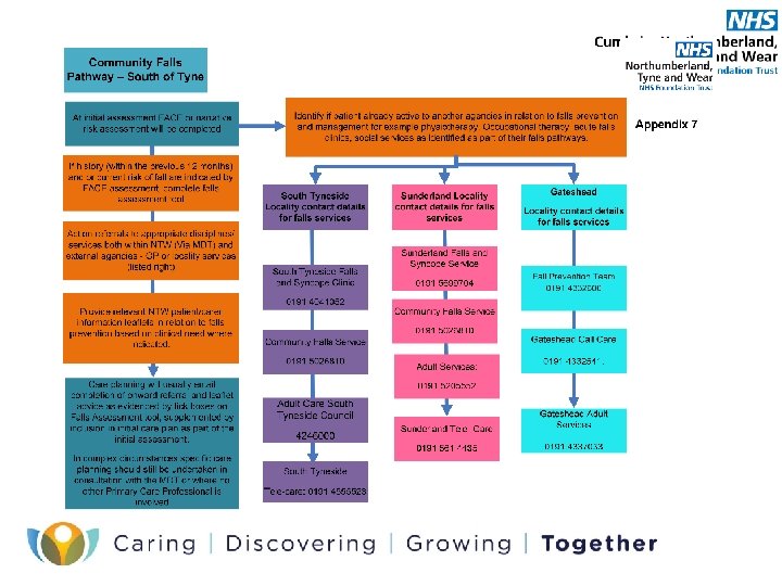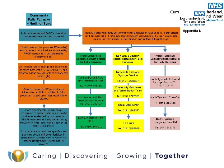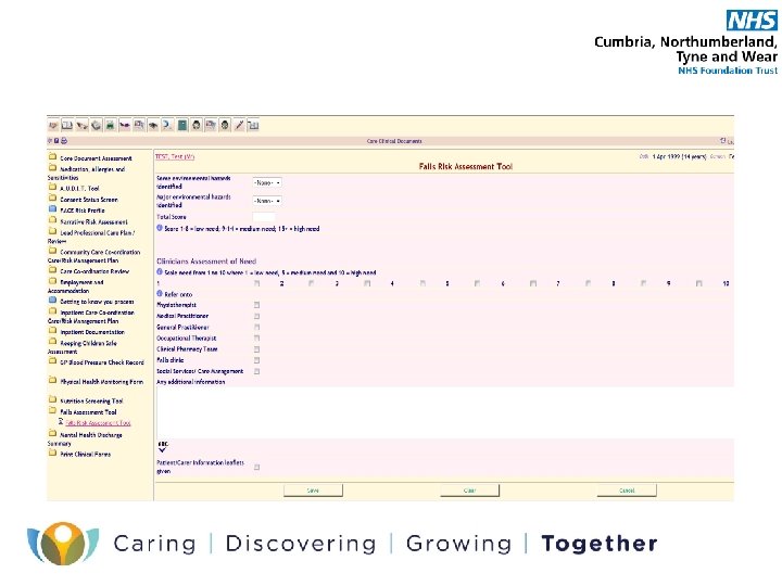 Falls Assessment • NTW Falls assessment tool is a rapid method of assessing a patients likelihood of falling and the things which are most likely to be contributing factors. • This is located within core assessment. • Consists of factors including types of falls people have experienced, medication, medical history, sensory communication and physical health • Each factor generates a score which identifies the level of need. • Scores provide guidance to the level of need and interventions required however this DOES NOT preclude clinical judgement. • Once the patients needs have been identified it is necessary to implement any referrals to other professionals and service providers. • For in patient areas a care plan aimed at modifying the risk factors should be devised by members of the MDT. • For community services care planning should focus on sign posting to relevant internal and external services and supplying service user/carer information leaflets