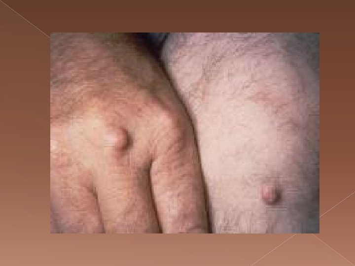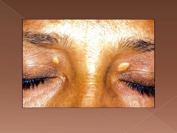 And in the form of lumps in the tendons of the hands, elbows, knees and feet(xanthoma) A xanthoma or xanthomata is a deposition of yellowish cholesterol-rich material in tendons or other body parts.