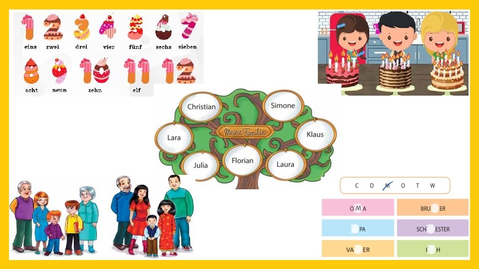 Antworte: Wie alt bist du? Ich bin … Jahre alt. • Wie alt sind deine Verwandten? Mein/Meine … ist … Jahre alt. • • Wie viele Geschenke wünschst du dir zum Geburtstag? Zum Geburtstag wünsche ich mir … Geschenke.