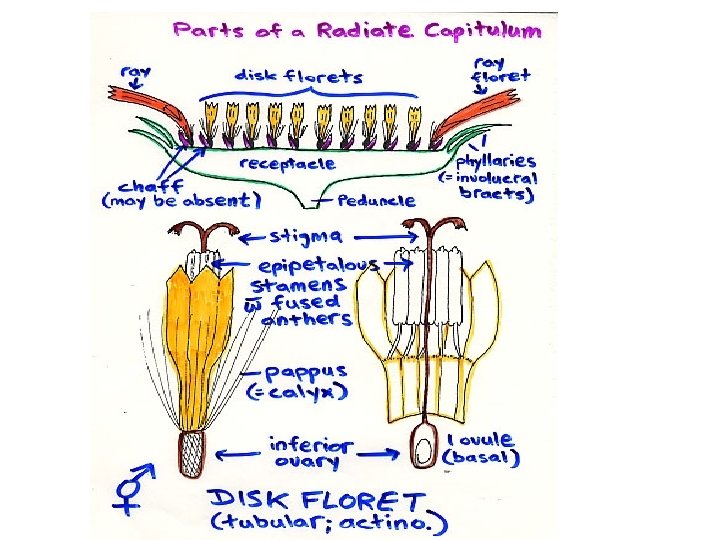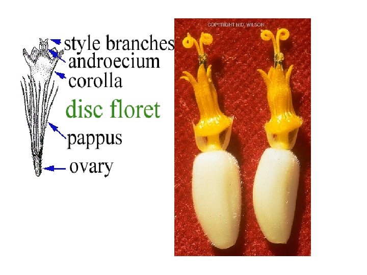 Identifying Characters • • • Plant mostly herb, some are climbers Leaves usually exstipulate Involecre bract present Ray and disc floret present Calyx reduce to papus or scales Stamens epipataloiou with syngenessus anther Ovary inferior, bicarpellary syncarpous, unilocular Basal Placentation Fruit cypsela