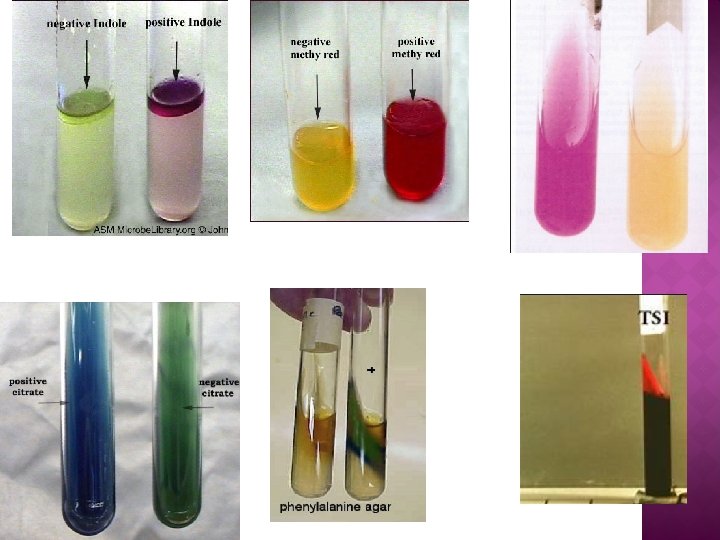 d)Biochemical Reactions : � Indole positive – P. vulgaris / negative – P. mirabilis � MR positive and VP negative � Citrate variable � Urease positive � TSI CATALASE TEST – K/A, gas, H 2 S OXIDASE TEST