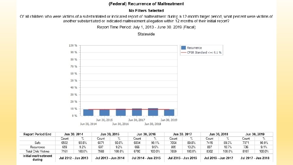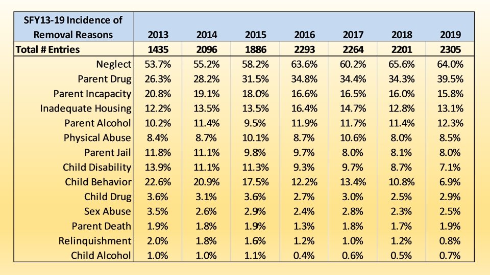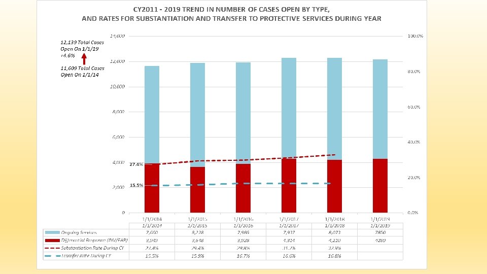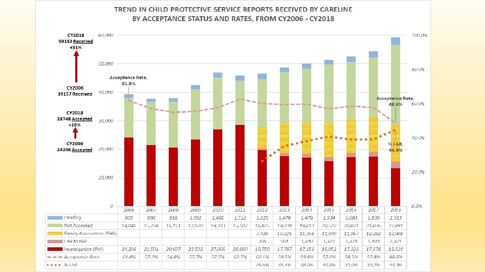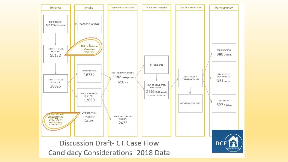 Comparison of Accepted vs. Screened-Out Reports Received During SFY 19 • Screen-out Rate = 54. 7% • DCF Regional variation <2% • 5 CT Regions vary from 51% in Urban Core to 60% in Wealthy • 72% Not Abuse/Neglect, 11% Ongoing Issues, 10% Duplicate Info • Accepted Reports • Screened Out Reports • Reporters • Alleged Victims • 36% School/Daycare • 23% Legal/Law Enforcement • 22% Health/Behavioral Health • Higher % of Children Ages <=5 • Higher % of Black and Hispanic • 41% School/Daycare • 13% Legal/Law Enforcement • 23% Health/Behavioral Health • Higher % of Children Ages 13 – 17 • Higher % of Other Race