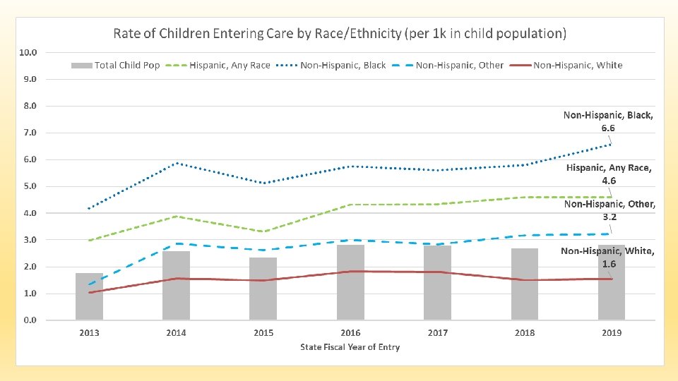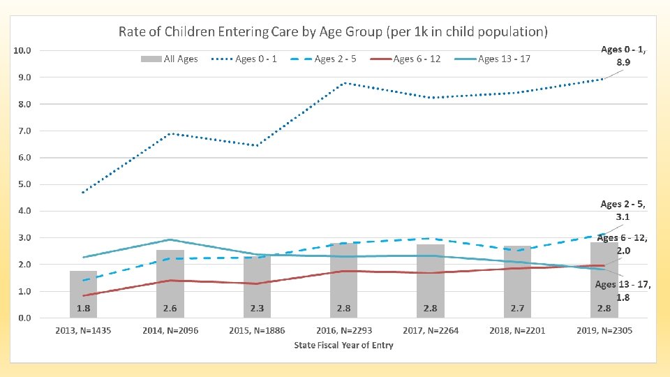 Key Results for Entries to DCF Care • Highest Entry Rates in Region 3, especially New London County • Lowest Entry Rates in Region 1, especially Fairfield County • Age – infants/toddlers enter DCF care at much higher rates than older children • Race/ethnicity – children of color enter DCF care at much higher rates than white children • Substance use/abuse issues both increasing, and largest single reason for entry to DCF care • Neglect and Inadequate Housing also important reasons for entry • Future Consideration • Plan to conduct more robust statistical analysis to better inform characteristics of Entry populations soon!