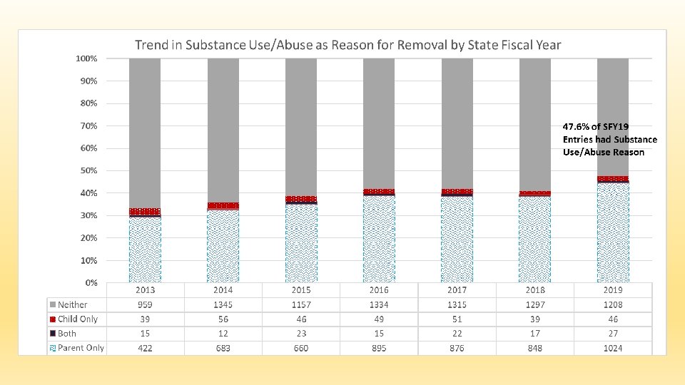 Marijuana is the most common substance identified in notifications. Percent of Notifications Involving each Substance Marijuana • 84. 3% of notifications involved only one substance 77, 2 Methadone 10, 1 Cocaine • Marijuana was identified in 77. 2% of notifications – with or without other substances 8, 1 Buprenorphine 5, 3 Non-Rx Opiate 5, 1 Alcohol • 185 newborns (15. 4%) were identified as having exposure to any MAT (buprenorphine +/or Methadone) • 1. 7% of newborns were reportedly born with cocaine and any MAT exposure 3, 4 0 10 20 30 40 50 60 70 80 90 1 4