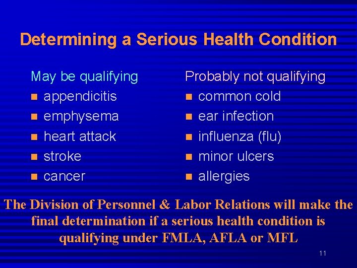 Determining a Serious Health Condition May be qualifying n appendicitis n emphysema n heart attack n stroke n cancer Probably not qualifying n common cold n ear infection n influenza (flu) n minor ulcers n allergies The Division of Personnel & Labor Relations will make the final determination if a serious health condition is qualifying under FMLA, AFLA or MFL 11