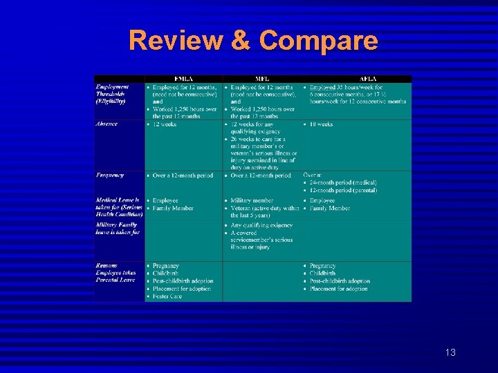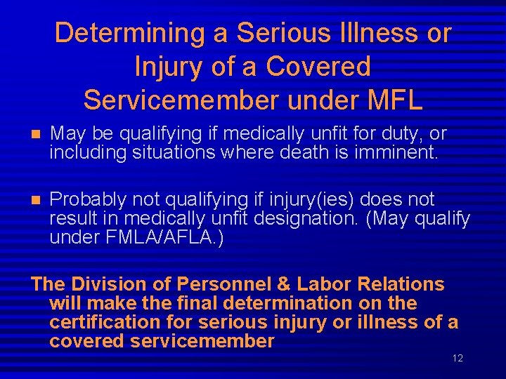 Determining a Serious Illness or Injury of a Covered Servicemember under MFL n May be qualifying if medically unfit for duty, or including situations where death is imminent. n Probably not qualifying if injury(ies) does not result in medically unfit designation. (May qualify under FMLA/AFLA. ) The Division of Personnel & Labor Relations will make the final determination on the certification for serious injury or illness of a covered servicemember 12