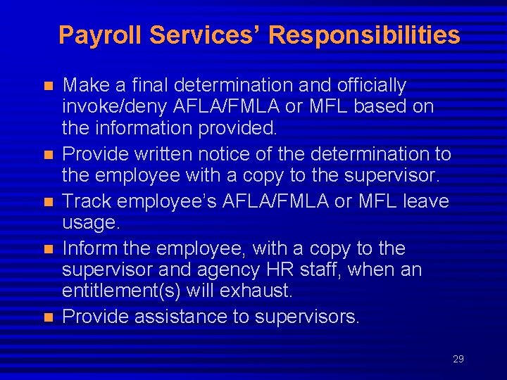 Record Keeping n AFLA/FMLA or MFL paperwork is filed in an employee’s official medical file which is kept at the Payroll Services office. 28