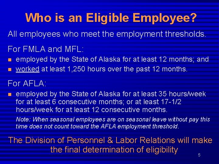 Entitlements continued Alaska Family Leave Act of 1992 (AFLA) Serious Medical Conditions: Provides a job protected absence for up to 18 weeks in a 24 month period to eligible employees for a qualifying condition. Parental Leave: Provides a job protected absence for up to 18 weeks in a 12 month period to eligible employees for pregnancy, childbirth, or adoption. When an employee is eligible under more than one Act, the entitlements run concurrently 4