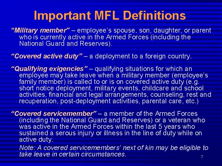 Important MFL Definitions “Military member” – employee’s spouse, son, daughter, or parent who is currently active in the Armed Forces (including the National Guard and Reserves). “Covered active duty” – a deployment to a foreign country. “Qualifying exigencies” – qualifying situations for which an employee may take leave when a military member (employee’s family member) is called to or is on covered active duty (e. g. short notice deployment, military events, childcare and school activities, financial and legal arrangements, counseling, rest and recuperation, post-deployment activities, parental care, etc. ) “Covered servicemember” – a member of the Armed Forces (including the National Guard and Reserves) or a veteran who was active in the Armed Forces within the last 5 years who sustained a serous injury or illness in the line of duty while on active duty. Note: A covered servicemembers’ next of kin may be eligible to take leave in certain circumstances. 7