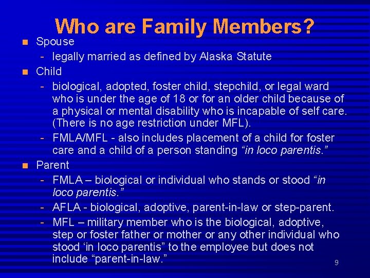 Reasons for taking FMLA, AFLA or MFL n n n For a serious health condition that makes the employee unable to perform their job (FMLA/AFLA). To care for an employee’s eligible family member who has a serious health condition (FMLA/AFLA/MFL). To care for an employee’s child after birth (FMLA/AFLA), placement for adoption (FMLA/AFLA), or foster care (FMLA only). Any qualifying exigency arising out of the fact that the spouse, son, daughter or parent of the employee is on covered active duty or has been notified of an impending call to active duty (MFL). To care for a family member who is a military member or veteran recovering from serious illness or injury sustained in the line of duty on active duty, or for the fatality of a military 8 member (MFL).