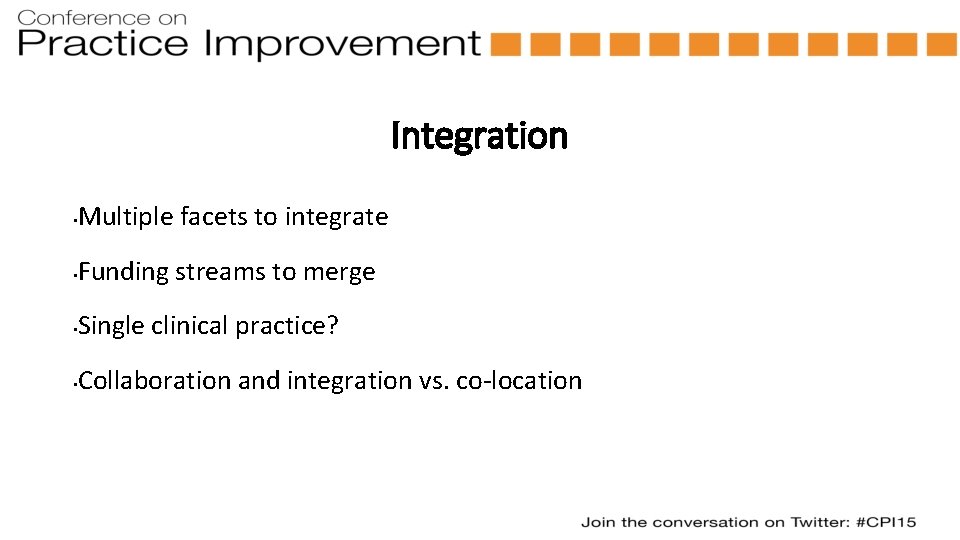 Challenges of integration • What does integration mean? • How to integrate care? • How to integrate training? • How do we blend differing practice cultures?