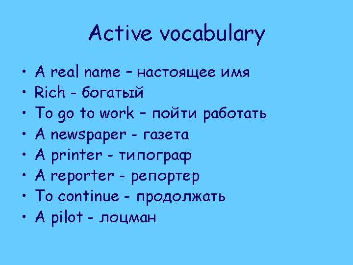 Active vocabulary • • • To write A writer A century A novel Strange Surprising Adventures Was based A sailor Alone • • • Desert island However To contain To become Everyone To believe To learn To catch goats To make pots An umbrella