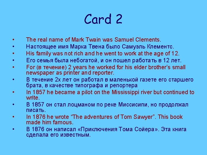 Mark Twain • The real name of this writer was Samuel Clements. • He was born in 1835 in the United States. • In 1876 he wrote “The adventures of Tom Sawyer”. This book made him famous.